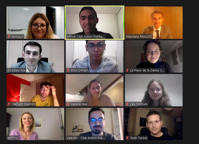 Lancé en décembre 2018, le club des étudiants de l’Action publique a organisé une rencontre en avril 2019 puis une en novembre et une décembre. Cette année, une première rencontre virtuelle a eu lieu en octobre autour de la fonction publique territoriale et une deuxième en décembre sur la préparation aux concours administratifs, une troisième en février sur les métiers du conseil. Désormais animé par Léa Socheleau (promo 2021), ce club organise des échanges et rencontres entre anciens et actuels étudiants des parcours de l’Action publique.